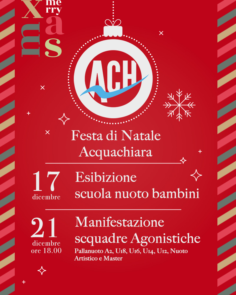 Il clima natalizio entra ufficialmente negli impianti Acquachiara con due eventi speciali pensati per coinvolgere famiglie, atleti e appassionati. Sarà l’occasione ideale per vivere insieme lo spirito di festa e per scoprire da vicino il lavoro svolto durante l’anno nelle nostre piscine e nelle nostre squadre.